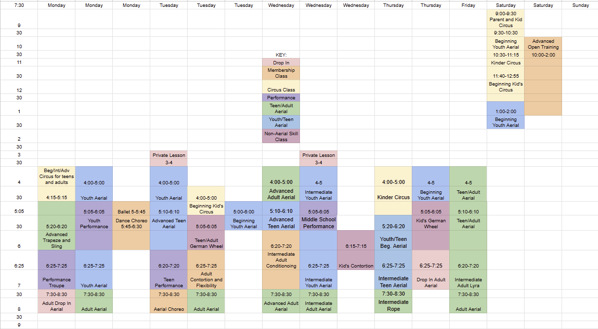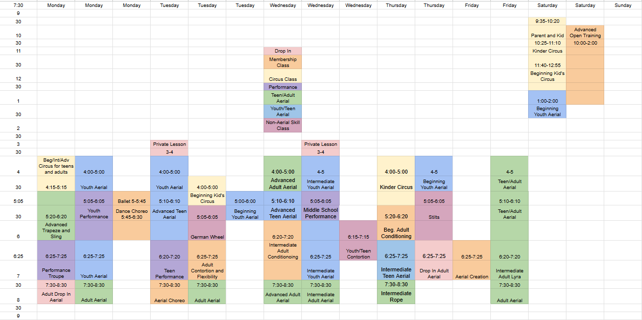Conditioning, Flexibility, Ballet and Dance Choreography, Aerial Choreography, Open Training [In orange on the schedule graph]