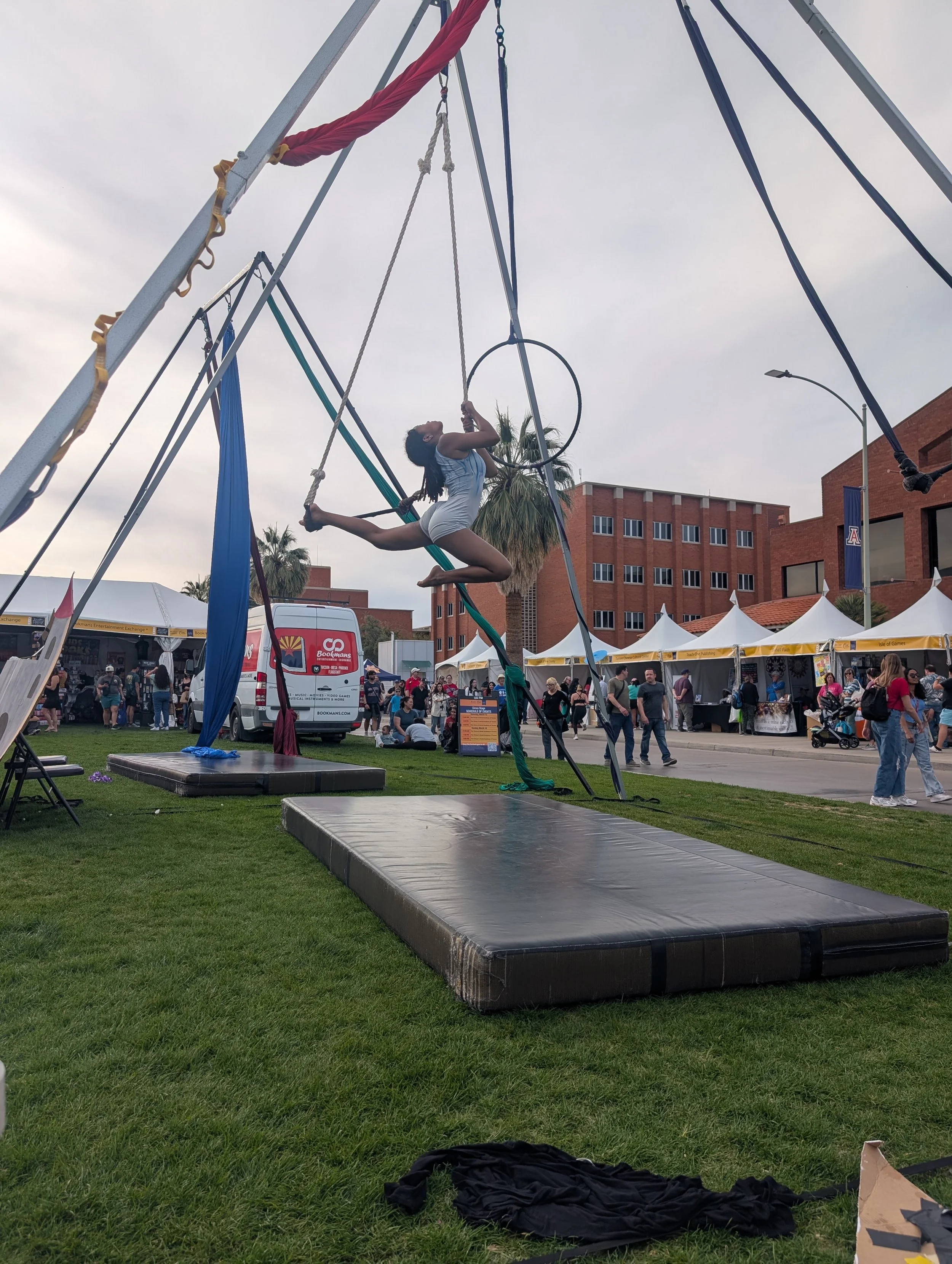 The circus academy is one of my favorite places in Tucson! I love how circus combines artistry and strength training. The circus community here is really special, too- it's so welcoming! The instructors and the other students are super supportive and kind, and just the best kind of people. I've been doing aerials for 7 years. When I started I was a little nervous, because I had no experience and was starting well into adulthood, but I shouldn't have worried- the aerial curriculum is approachable, safety-conscious, and most of all fun at every level. I especially love exploring new apparatuses and performing with friends new and old!