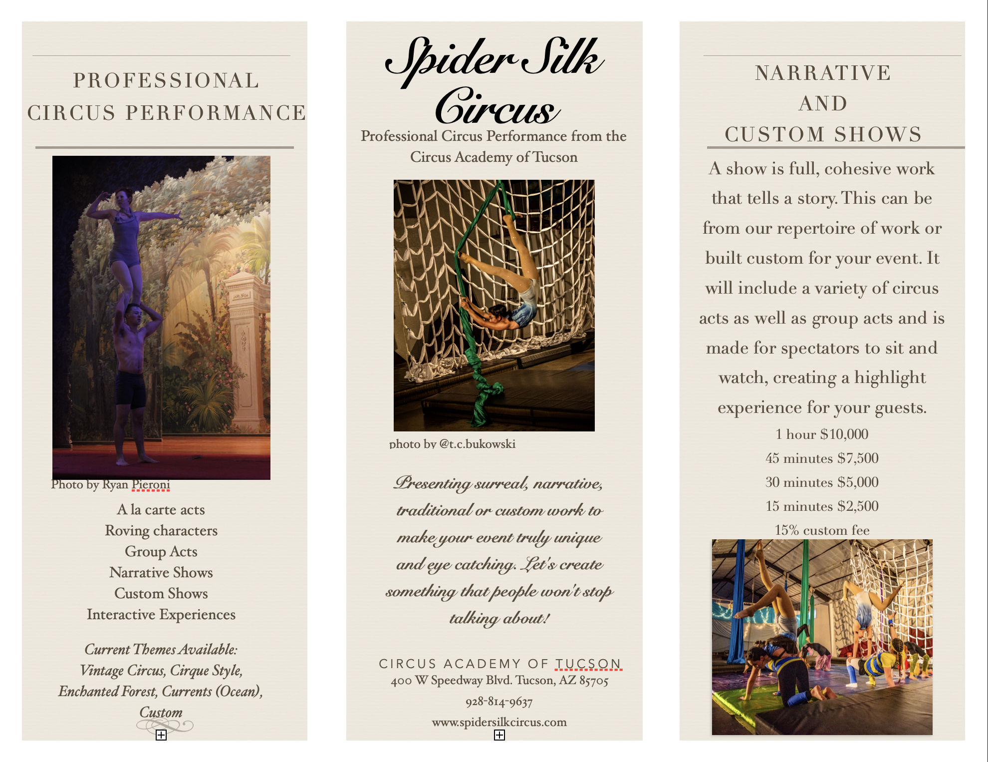 Contact us for more info on hiring Circus Academy performers for you special event! Our professional performing group is called Spider Silk Circus. We can provide entertainment from a single performer to add that special touch to your event, to large scale performance to make your event spectacular!